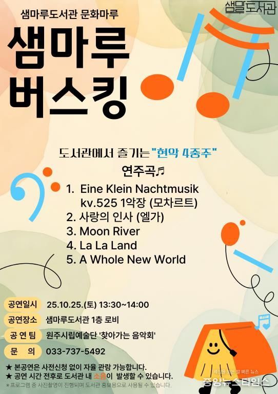 (중앙뉴스타임스 = 방재영 기자) 샘마루도서관은 오는 25일 도서관 로비에서 ‘샘마루버스킹-현악 4중주’ 공연을 개최한다.