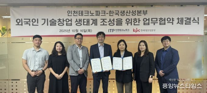 (중앙뉴스타임스 = 방재영 기자) 인천테크노파크는 지난 16일 한국생산성본부와 ‘외국인 창업 활성화 및 창업 생태계 조성을 위한 업무협약(MOU)’을 체결했다.