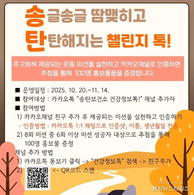 (중앙뉴스타임스 = 방재영 기자) 평택시 송탄보건소는 10월 20일부터 11월 14일까지 카카오톡을 활용한 ‘(송)글송글 땀 맺히고 (탄)탄해지는 챌린지 톡!’을 운영할 예정이라고 밝혔다.