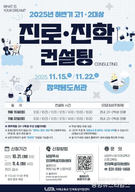 (중앙뉴스타임스 = 방재영 기자) 남양주시는 오는 21일부터 ‘2025년 하반기 진로·진학 컨설팅’참가자를 모집한다고 밝혔다.