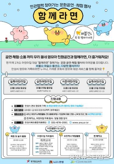 ▲일죽어린이집(10.18.) ▲삼희어린이집(10.20.) ▲서운어린이집(11.1.) ▲삼죽어린이집(11.15.) 등 4개소에서 ▲버블·매직쇼 ▲부모·자녀 체험활동 ▲에어바운스 등 다채로운 체험 프로그램이 진행되며, 아이들이 가을 하늘 아래 마음껏 웃고 뛰놀 수 있는 시간을 선사할 예정이다.