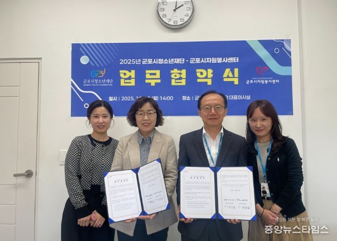 (중앙뉴스타임스 = 방재영 기자) 군포시청소년재단은 20일 군포시청소년재단 대표이사실에서 군포시자원봉사센터와 지역사회 상생 및 자원봉사 활성화를 위한 업무협약을 체결했다.