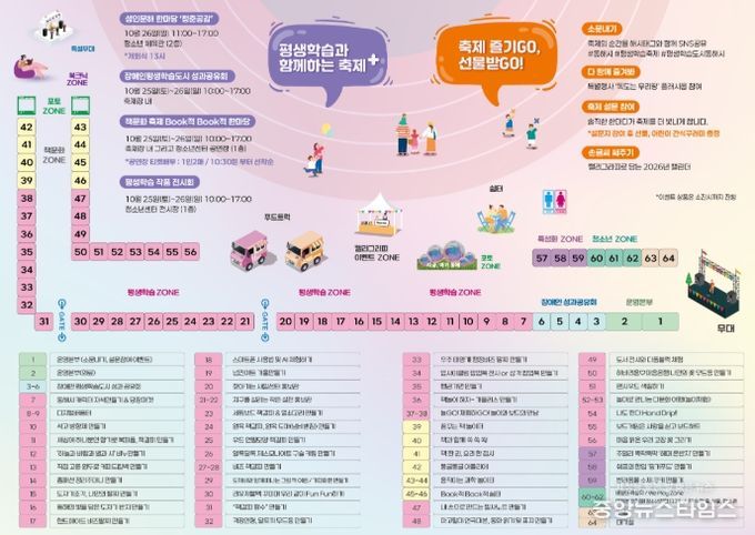 세대와 계층을 잇는 소통의 공간 조성을 위해 지역의 100여개 평생학습관련 기관·단체·동아리, 학습자 등이 참여하여 평생학습마당·BOOK적BOOK적한마당·장애인 평생학습한마당·문해교육 한마당 등 테마별로 나누어 공연발표(40여개), 체험·홍보존(50여개) 및 전시존을 운영하며, 어린이를 위한 뮤지컬, 마술극 등 다양한 프로그램도 진행된다.