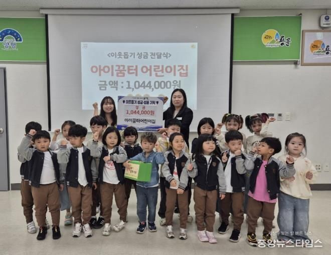 (중앙뉴스타임스 = 방재영 기자) 양평군 용문면은 지난 20일 용문면 소재 아이꿈터 어린이집이 주최한 ‘소소한 기쁨, 특별한 만남, 행복 나눔 작은 장터’ 바자회를 통해 마련된 수익금 1,044,000원을 용문면에 기탁했다고 밝혔다.