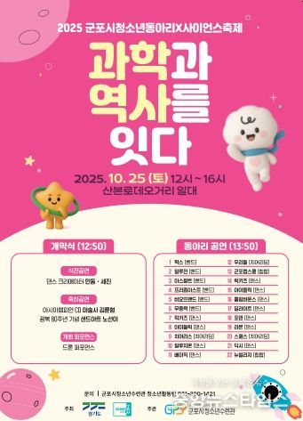 (중앙뉴스타임스 = 방재영 기자) (재)군포시청소년재단 산하 군포시청소년수련관은 오는 25일 12시부터 16시까지 산본로데오거리 일대에서 2025 군포시청소년동아리X사이언스축제 ‘과학과 역사를 잇다’를 펼친다. 청소년들에게 공연과 과학, 역사 체험의 기회를 제공하고 지역사회의 참여를 끌어내겠다는 취지이다.