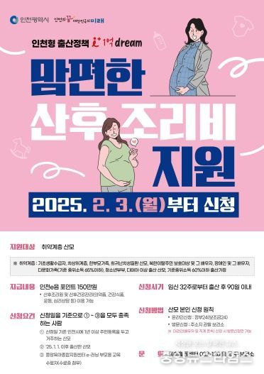 신청 기간은 임신 32주부터 출산 후 90일 이내까지다. 지급된 포인트는 지급일로부터 12개월간, 인천e음 가맹점 중 산후조리원 및 산후조리서비스 제공 업종에서 사용이 가능하다.