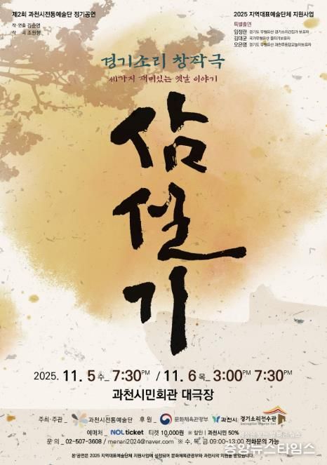 (중앙뉴스타임스 = 이광운 기자) 과천시는 오는 11월 5일과 6일 양일간 과천시민회관 대극장에서 과천시전통예술단의 창작 경기소리극 ‘삼설기’ 공연을 개최한다고 밝혔다. 공연은 5일 저녁 7시 30분, 6일에는 오후 3시와 저녁 7시 30분 두 차례에 걸쳐 이틀간 총 3회 진행된다.