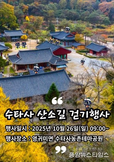 (중앙뉴스타임스 = 방재영 기자) 홍천군은 오는 10월 26일, 영귀미면 수타사 농촌테마공원 일원에서 ‘2025 수타사 산소길 걷기 행사’를 개최한다.
