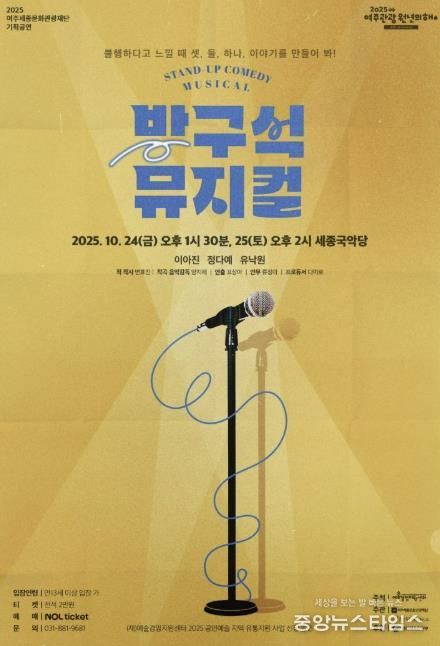 (중앙뉴스타임스 = 이광운 기자) 여주세종문화관광재단이 오는 10월 24일~25, 양일간 예술경영지원센터의 공모사업인 '공연예술 지역 유통지원 사업'의 일환으로 뮤지컬‘방구석 뮤지컬’을 세종국악당에서 개최한다.