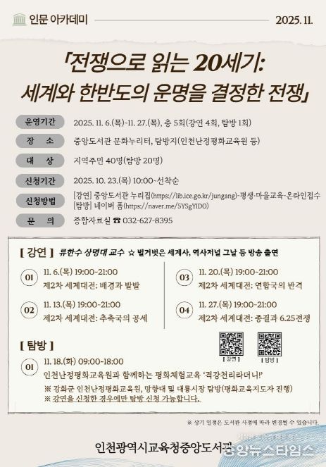 (중앙뉴스타임스 = 방재영 기자) 인천시교육청중앙도서관은 시민들의 인문학적 소양을 높이고 평화의 가치를 확산하기 위해 오는 11월 ‘인문 아카데미’를 운영한다고 23일 밝혔다.