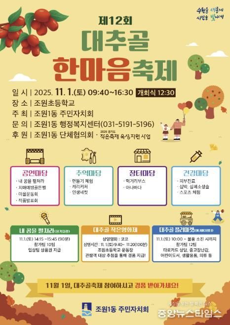 (중앙뉴스타임스 = 이광운 기자) 수원시 장안구 조원1동 주민자치회와 조원1동 단체협의회는 오는 11월 1일, 지역 주민이 함께 어울리는 ‘제12회 대추골 한마음 축제’를 개최한다.