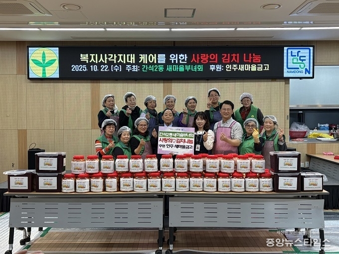 (중앙뉴스타임스 = 방재영 기자)인천 남동구 간석2동 행정복지센터는 최근 동 새마을부녀회로부터 ‘복지 사각지대 케어를 위한 사랑의 김치 나눔 행사’를 위해 직접 담근 총 250kg의 배추김치를 전달받아 복지 사각지대 70가구와 경로당 4개소에 전달했다고 24일 밝혔다.