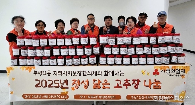 (중앙뉴스타임스 = 방재영 기자) 인천 부평구 부평4동 지역사회보장협의체는 지난 29일 동 행정복지센터에서 ‘정성 담은 고추장 나눔’ 행사를 진행했다고 밝혔다.