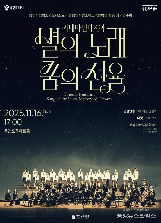 (중앙뉴스타임스 = 이광운 기자) (재)용인문화재단은 오는 16일 용인포은아트홀에서 용인시립청소년오케스트라와 용인시립소년소녀합창단 합동 정기연주회 '시네마 판타지아 : 별의 노래, 꿈의 선율'을 개최한다.