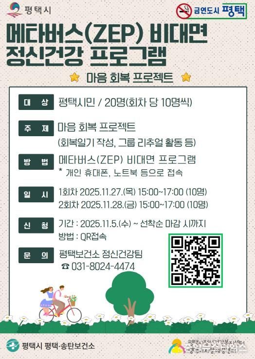참가를 원하는 시민은 정보무늬(QR코드)를 통해 사전 신청하고, 평택시 정신건강복지센터에서 체험 꾸러미를 수령해 신청한 일시에 머물고 있는 장소에서 메타버스로 접속하면 된다.
