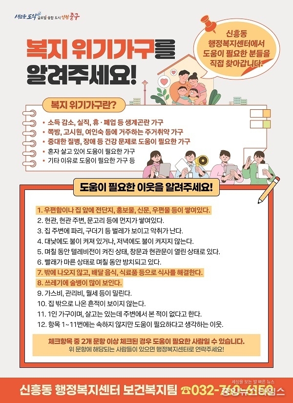 심규홍 신흥동장은 “주변의 숨은 위기가구를 조기 발굴하고 위기 상황을 선제적으로 예방하고자 이번 활동을 추진하게 됐다”라며 “더욱 촘촘한 사회안전망을 구축해 어려운 이웃들이 안전하게 겨울을 나도록 힘쓰겠다”라고 전했다.