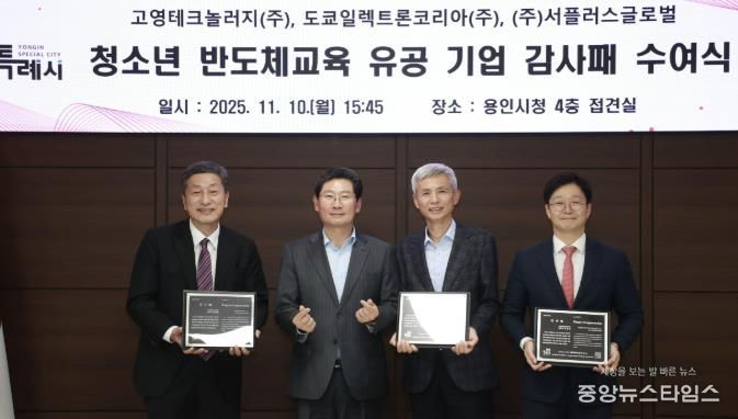 (중앙뉴스타임스 = 방재영 기자) 용인특례시는 10일 시청 접견실에서 ㈜서플러스글로벌과 업무협약(MOU)을 체결하고, 지역 청소년 반도체 교육에 기여한 기업 3곳에 감사패를 수여했다고 11일 밝혔다.