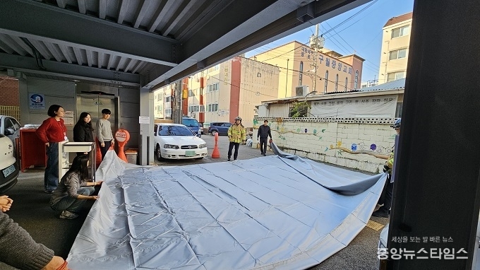 특히 최근에 빈번히 발생하는 전기차 화재 시의 대처 방법 등에 대한 이론 교육과 함께 비치된 질식 소화포로 실습을 했다.