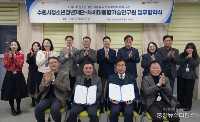 (중앙뉴스타임스 = 방재영 기자) 수원시청소년청년재단(이사장 최종진)과 차세대융합기술연구원(원장 김연상)은 20일 청소년·청년의 미래 역량 강화와 성장 지원을 위한 업무협약(MOU)을 체결했다.