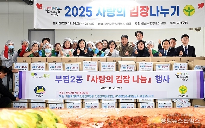 (중앙뉴스타임스 = 방재영 기자) 인천 부평구 부평2동 새마을부녀회는 25일 동 행정복지센터에서 지역 내 취약계층을 위한 ‘이웃사랑 김장 나눔’ 행사를 진행했다.