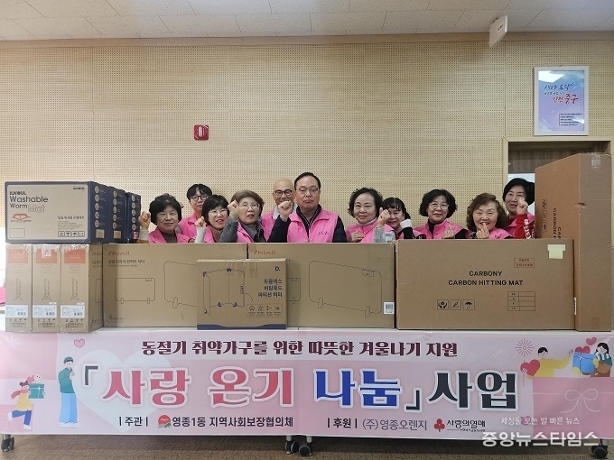 (중앙뉴스타임스 = 방재영 기자) 인천 중구 영종1동 지역사회보장협의체(공동위원장 이철호·김상권)는 겨울철 한파에 대비해 지난 20일 지역 취약 가구 20세대에 맞춤형 난방용품을 지원하는 ‘사랑 온기 나눔’ 사업을 추진했다.