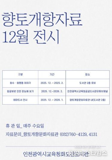 (중앙뉴스타임스 = 방재영 기자) 인천시교육청화도진도서관은 올해 12월부터 2026년 1월까지 지역문화와 향토자료를 주제로 전시 프로그램을 운영한다고 27일 밝혔다.