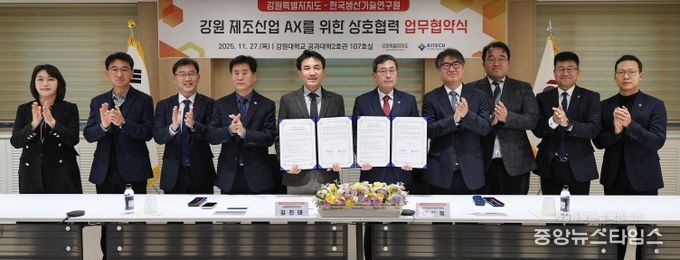 (중앙뉴스타임스 = 방재영 기자) 강원특별자치도는 27일 강원 제조산업의 AX(AI Transformation, 인공지능 전환)를 위한 상호 협력을 강화하기 위해 한국생산기술연구원(원장 이상목)과 업무협약(MOU)을 체결했다.