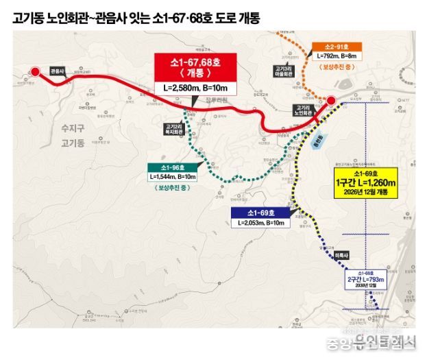 (중앙뉴스타임스 = 방재영 기자) 용인특례시는 지난 11월 30일 수지구 고기동 노인회관에서 관음사까지 이어지는 도시계획도로 소1-67·68호선(연장 2.58km)을 개통했다고 1일 밝혔다.