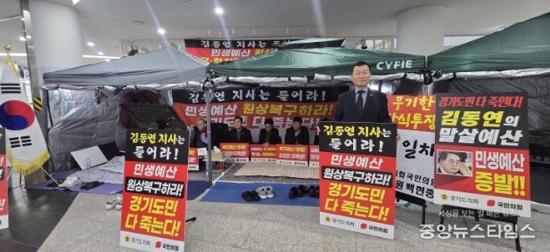 최근 경기도의회 국민의힘 백현종 대표의원은 경기도가 어르신·장애인 등 사회적 약자를 위한 민생 예산을 대폭 삭감하고, 행정사무감사 출석을 거부하는 초유의 사태에 항의하며 무기한 삭발 및 단식 농성에 돌입했다. 이에 국민의힘 의원들은 백 대표의원의 투쟁에 연대하며 민생예산 복구와 김 지사 정무·협치 라인의 파면을 요구했다.