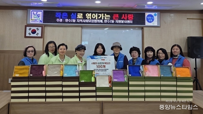 (중앙뉴스타임스 = 방재영 기자) 인천 남동구 만수2동 행정복지센터는 따뜻한 겨울나기 지원을 위한 ‘손뜨개 목도리 나눔 사업’을 통해 홀몸 어르신 100명에 목도리를 전달했다고 3일 전했다.