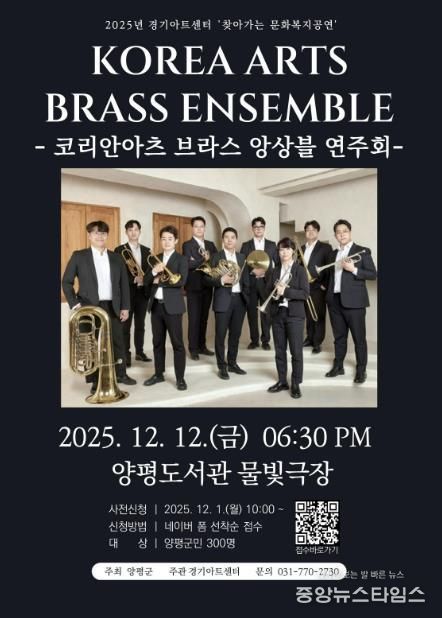 (중앙뉴스타임스 = 이광운 기자) 양평군은 지역 주민에게 품격 있는 문화 향유 기회를 제공하고자 오는 12월 12일 양평도서관 물빛극장에서 ‘연말 맞이 찾아가는 문화복지 공연’을 개최한다고 밝혔다.