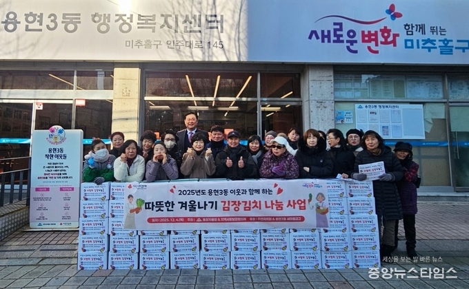 (중앙뉴스타임스 = 방재영 기자) 인천 미추홀구 용현3동 통장자율회(회장 조환호)와 지역사회보장협의체(위원장 김유경)는 4일 연말을 맞아 관내 어려운 이웃들을 위한 ‘따뜻한 겨울나기 김장 김치 나눔 행사’를 진행했다.