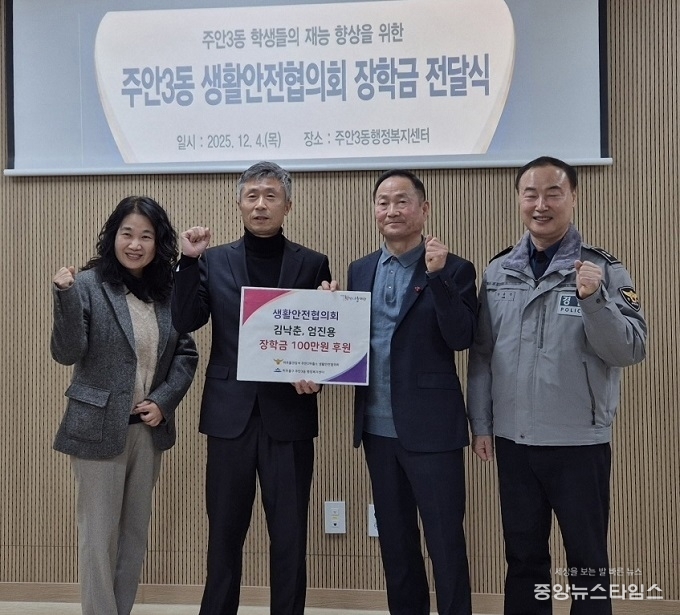 (중앙뉴스타임스 = 방재영 기자) 인천 미추홀경찰서 주안2파출소 생활안전협의회(회장 김낙춘, 이하 협의회)는 지난 4일 지역사회의 미래인 청소년들이 꿈과 희망을 잃지 않고 학업에 정진할 수 있도록 장학금 100만 원을 주안3동에 전달했다.