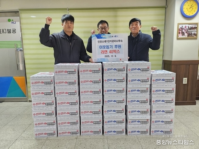 인천소래1단지 관리사무소는 어려운 지역 주민을 위해 매년 십시일반 성금을 모아 식료품을 기부하고 있으며, 이번에 기부된 라면은 소래1단지 내 도움이 필요한 가정에 전달될 예정이다.