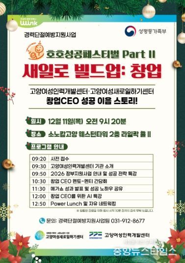 (중앙뉴스타임스 = 방재영 기자) 고양여성새로일하기센터는 오는 11일 오전 9시 20분, 소노캄 고양에서 ‘호호 성공페스티벌 Part II – 새일로 빌드업 창업’을 개최한다고 밝혔다.