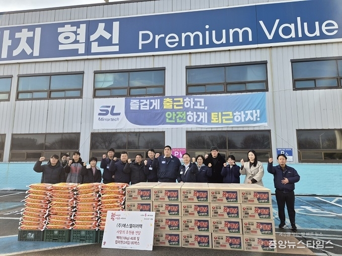 (중앙뉴스타임스 = 방재영 기자) ㈜에스엘미러텍(대표이사 김재규)은 지난 6일 사랑의 백미(10kg) 40포 및 컵라면(24개입) 80박스를 시흥시1%복지재단에 기부하는 전달식을 진행했다.