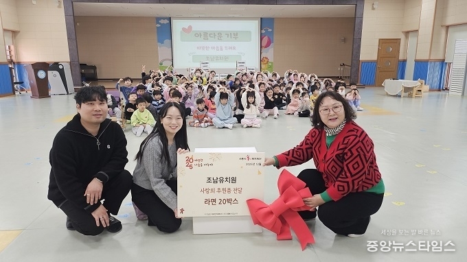 (중앙뉴스타임스 = 방재영 기자) 조남유치원(원장 김미숙)은 지난 8일 사랑의 라면 20박스를 시흥시1%복지재단에 기부하는 전달식을 진행했다.