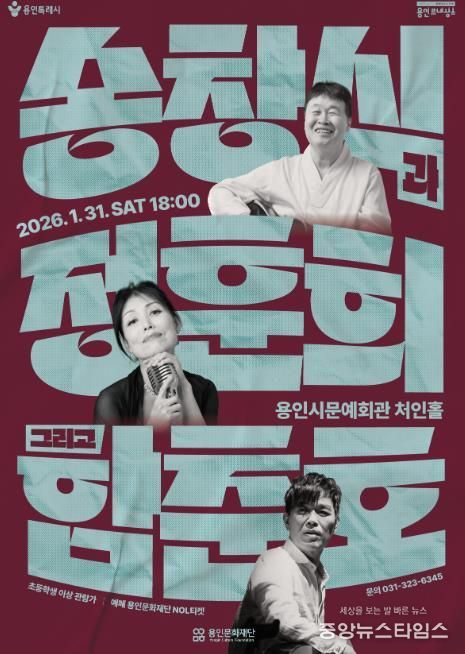 (중앙뉴스타임스 = 이광운 기자) 용인문화재단은 2026년 1월 31일 오후 6시 용인시문예회관 처인홀에서 한국 대중음악의 거장들이 함께하는 공연⟨송창식과 정훈희 그리고 함춘호⟩를 개최한다. 이번 공연은 2026년 처인구 문화콘텐츠 브랜드 ‘만원 조아용’ 시리즈의 일환으로 마련된 것으로, 새해를 맞아 용인시민 누구나 부담 없이 즐길 수 있는 고품격 공연을 선보이고자 기획됐다.