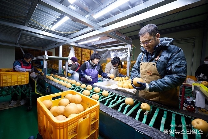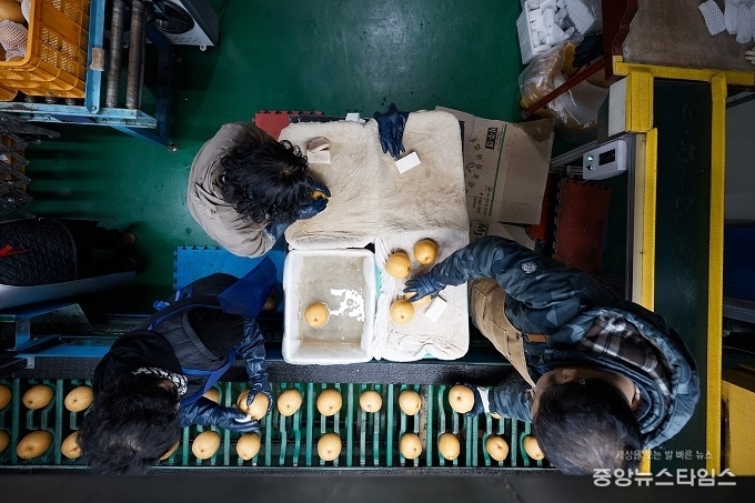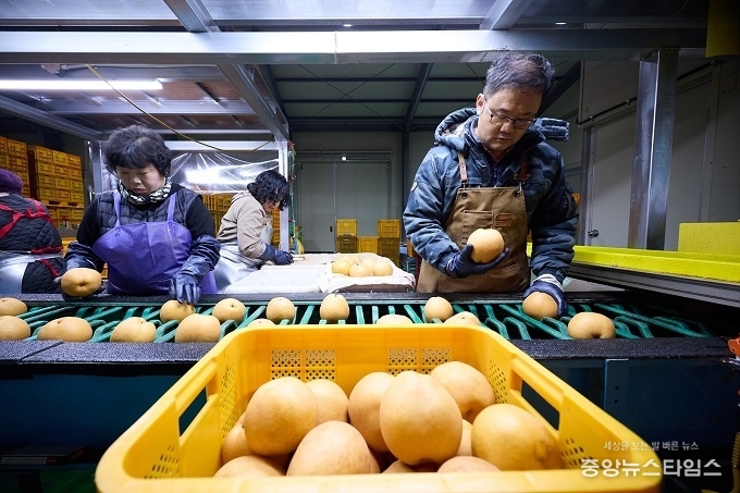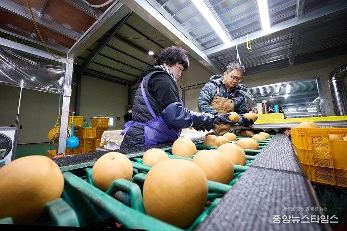 (중앙뉴스타임스 = 방재영 기자) 농촌진흥청에서 인증하는 탑프루트 사업에 선정된 양주시 배영농조합법인 선별작업장에서 지역에서 수확한 농산물이 철저한 선별과 포장을 거쳐 대만으로 전량 수출되고 있다. 양주 농업의 품질 경쟁력이 해외 시장에서도 인정받고 있다.