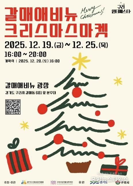 (중앙뉴스타임스 = 이광운 기자) 구리시상권활성화재단은 오는 12월 19일부터 25일까지 갈매 애비뉴 광장에서 ‘2025 구리윈터페스타–갈매애비뉴 크리스마스 마켓’을 개최한다고 밝혔다.