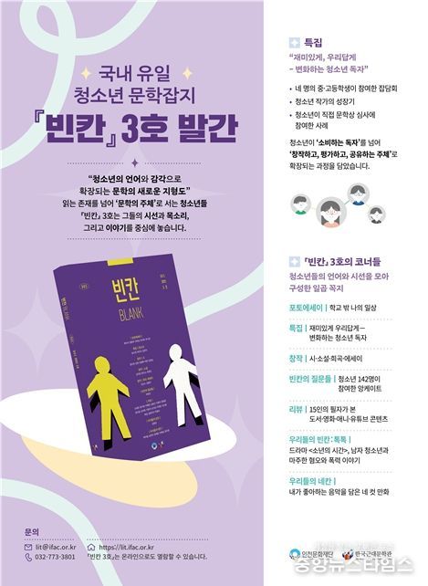 (중앙뉴스타임스 = 방재영 기자) 인천문화재단 한국근대문학관은 국내 유일의 청소년 문학잡지 [빈칸] 3호를 발간했다.