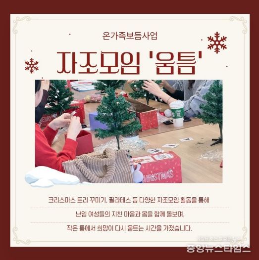 (중앙뉴스타임스 = 방재영 기자) 인천동구가족센터(센터장 박미희)는 난임 여성의 심리적 부담을 줄이기 위해 온가족보듬사업 자조모임 ‘움틈’을 11월 14일~12월 12일까지 운영했다고 19일 밝혔다.