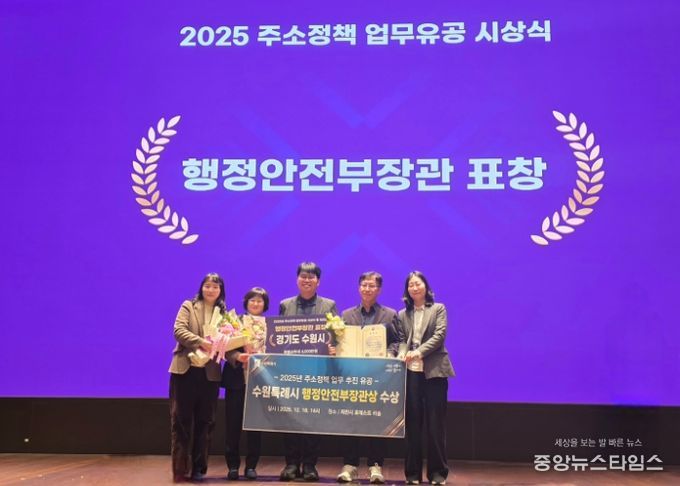 (중앙뉴스타임스 = 방재영 기자) 수원특례시가 행정안전부 주관 ‘2025 주소정책 워크숍’에서 ‘2025 주소정책 업무 분야 우수기관’으로 선정돼 행정안전부 장관 표창을 받았다. 특별교부세 4000만 원도 확보했다.