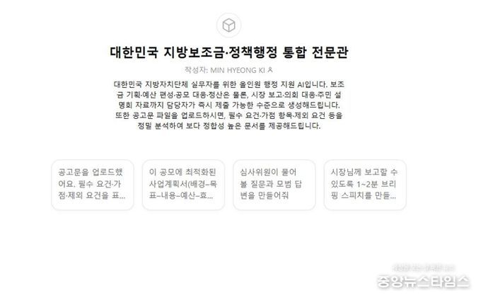 영예의 대상은 조양동주민센터 민형기 행정팀장이 차지했다. 민 팀장은 ‘대한민국 지방보조금 정책 행정 통합 전문관’ 작품을 통해 복잡한 지방보조금 업무를 AI로 통합 관리·효율화하는 모델을 제시해 심사위원들의 높은 평가를 받았다. 대상 수상자에게는 시장 표창과 함께 50만 원의 상금이 수여된다.