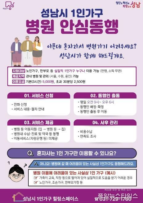 (중앙뉴스타임스 = 방재영 기자) 성남시는 ‘1인 가구 병원 안심 동행 서비스’ 추진을 위해 전문 인력을 기존 4명에서 5명으로 늘렸다고 22일 밝혔다.