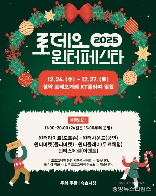 (중앙뉴스타임스 = 방재영 기자) 속초시가 12월 24일부터 27일까지 설악로데오거리 KT플라자 일원에서 ‘2025 로데오 윈터 페스타’를 개최한다.