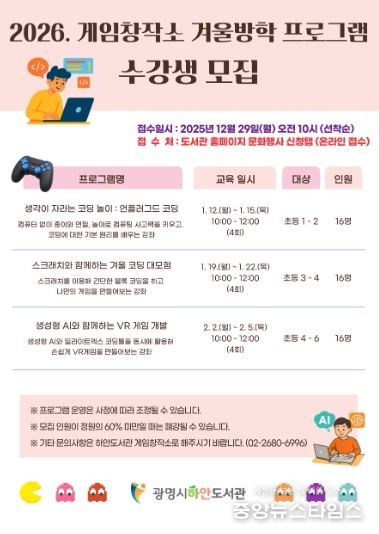 (중앙뉴스타임스 = 이광운 기자) 광명시 게임창작소는 오는 29일 오전 10시부터 겨울방학 프로그램 수강생을 모집한다.
