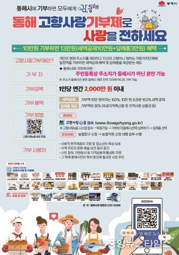 (중앙뉴스타임스 = 방재영 기자) 동해시는 연말정산 시기를 맞아, 지속적인 기부 참여 분위기를 조성하고 고향사랑기부제 활성화를 도모하기 위해‘연말 추가 이벤트’를 추진한다.