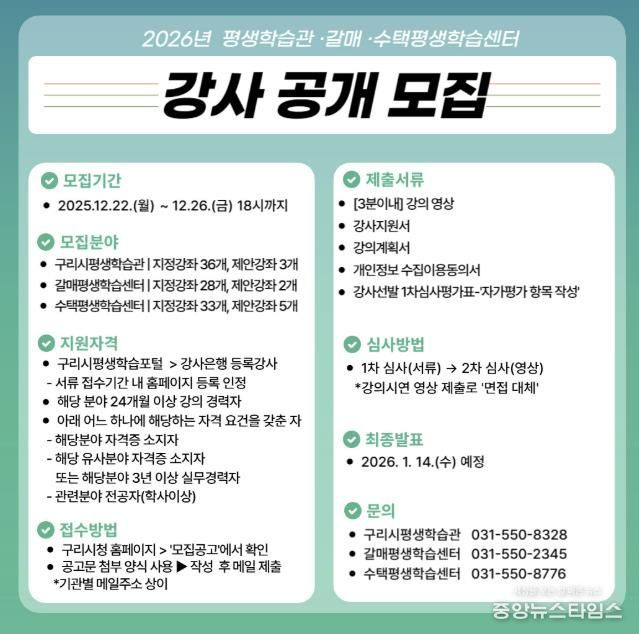 (중앙뉴스타임스 = 방재영 기자) 구리시는 오는 26일 오후 6시까지 ‘2026년 구리시평생학습관·갈매평생학습센터·수택평생학습센터 평생교육 프로그램’을 함께 이끌어갈 역량 있는 강사를 공개 모집한다고 23일 밝혔다.