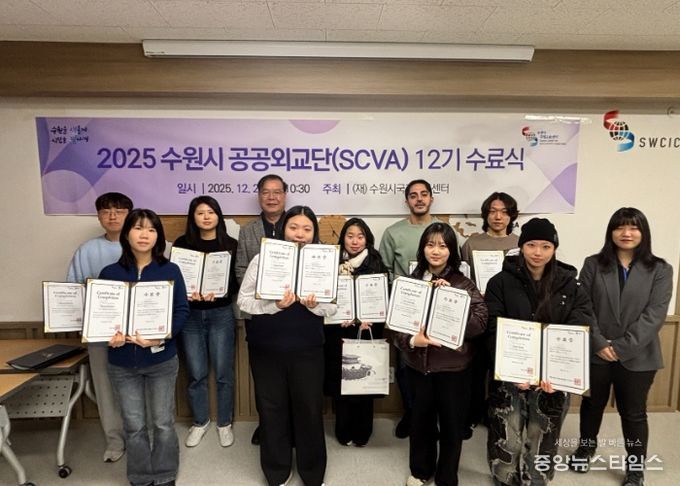 (중앙뉴스타임스 = 방재영 기자) 수원시국제교류센터가 22일 센터에서 ‘수원시 공공외교단(SCVA) 12기’ 수료식을 열고, 단원 16명에게 수료증을 전달했다. 우수활동자 4명에게는 상장을 수여했다.